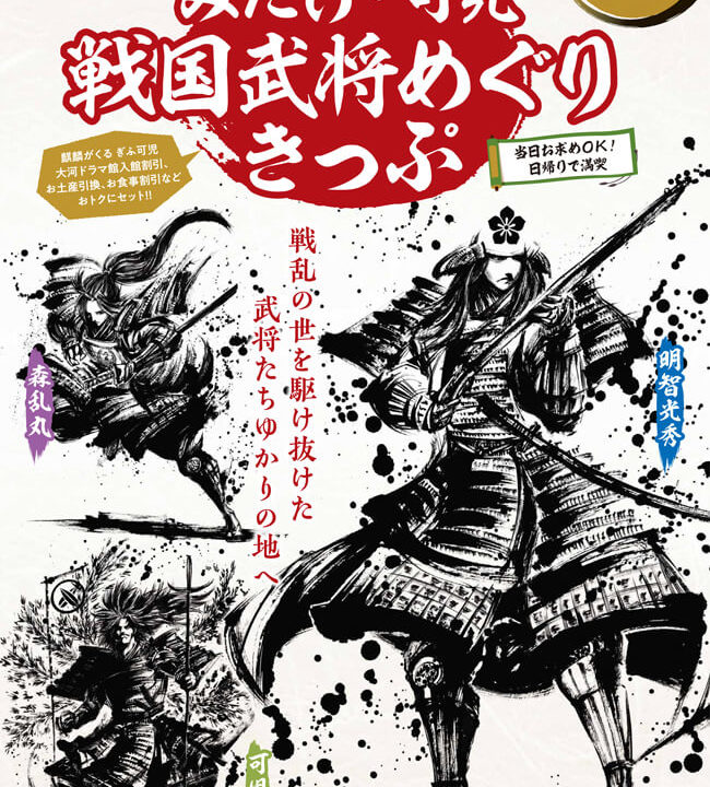 告知、ポスター墨絵で戦国キャンペーンのビジュアルを作成 @okazu-FAN 2020年2月10日 2020.02.19 戦国キャンペーンのビジュアルを墨絵で! 今月11日から3月31日まで「みたけ・可児戦国武将めぐりきっぷ」が発売されます。御歌頭さんは明智光秀、森乱丸、可児才蔵のビジュアルを墨絵にて描かれました。これは戦国キャンペーンで御嵩町×可児市×名鉄にて開催されていて、指定店舗を2店利用することで墨絵クリアファイルをゲットすることができます。この機会に名鉄を利用し戦国を感じてみてはいかがでしょうか。詳細 → 「みたけ・可児戦国武将めぐりきっぷ」の発売 戦国キャンペーン