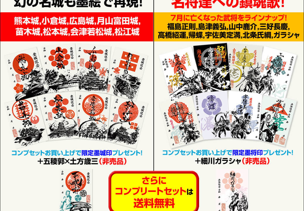 御歌頭グッズ御城印・武将印 墨絵第三弾の発売スタート @okazu-FAN 2020年7月29日 御城印・武将印 墨絵第三弾の発売スタート 7月28日。 大人気の御城印・武将印の墨絵第三弾が発売されました。御城印、武将印ともに絵柄は8種類で、今回もコンプリートセットには非売品の墨絵印を1枚プレゼント!是非ゲットしてください。詳細:墨城印・墨将印|御城印帳、他 コンプリートセット 御城印 武将印