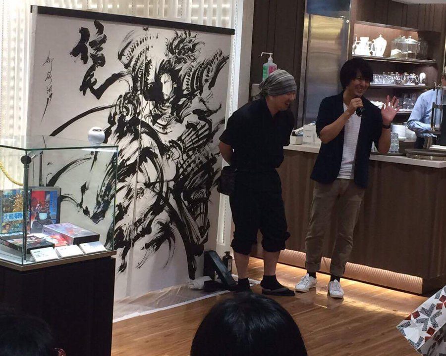イベント9月1日の日本三越本店でのイベントが無事終了しました @okazu-FAN 2017年9月2日 昨日、日本三越本店7Fにて行われたライブペイントで描かれた「信長の野望をリスペクトした絵」です。告知が急だったにもかかわらず、足を運んでくださった皆様、ありがとうございました。 今回行われたライブペイントの絵は、ライブペイントを行った会場に2週間くらい展示する予定です。さらに新作Tシャツ、画集など、御歌頭さんの墨絵作品の販売も行われているので、イベントに足を運べなかった方や、御歌頭さんの墨絵作品ファンの方は是非足を運んでみてくださいね。 日本三越本店 織田信長
