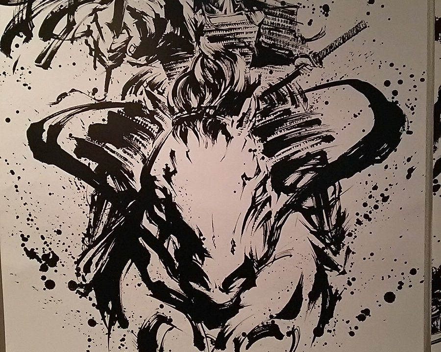 小田原市の各所に展示される小田原城の観光ポスターを御歌頭さんが墨絵で描きました。